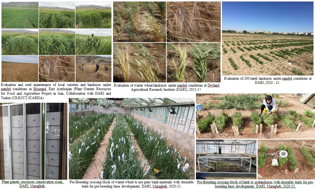 Pre-breeding refers to all activities and strategies designed to identify desirable characteristics or genes from gene bank materials to extend the genetic diversity of breeding germplasm. Since these martial could not be used directly in the breeding program because the genes of interest may be tightly linked to unfavorable genes. Pre-breeding is a bridge between unadapted materials and a breeding program. Hundreds of national and international winter wheat and lentil accessions, landraces, synthetic derivative lines, wild species have been evaluating at Dryland Agricultural Research Institute (DARI) every year. For winter wheat, 13 and 48 pre-breeding F1, F2 segregating populations, respectively, are under evaluation in Maragheh, and 118 pre-breeding F3 populations are in Maragheh and Zanjan in 2020-21. For the pre-breeding winter wheat crossing block, 97 landraces from Turkey, Afghanistan, and Iran have been planted in the greenhouse in 2020-21 and crosses are in the process to develop pre-breeding lines. Also, 150 winter wheat landraces are screening for desirable traits under rainfed conditions in Maragheh. For lentil crop, 200 landraces, collected from cold regions of East Azerbaijan, are evaluating for desirable traits such as plant height, erect type, large seed, green hull color, and earliness under rainfed conditions at DARI in 2020-21. In the lentil crossing block program 47 crosses have been made and 63 F1 generations were collected. Because of climate change and diverse environments of rainfed areas, DARI is designing a very comprehensive pre-breeding program to explore the valuable genetic diversity of gene bank material including, landraces, accessions, local varieties, wild relatives of winter wheat, barley, lentil, chickpea crops. Eventually, to reduce the time required for cultivar development, the speed breeding program integrated into the pre-and breeding program which reducesthe time by three to five years